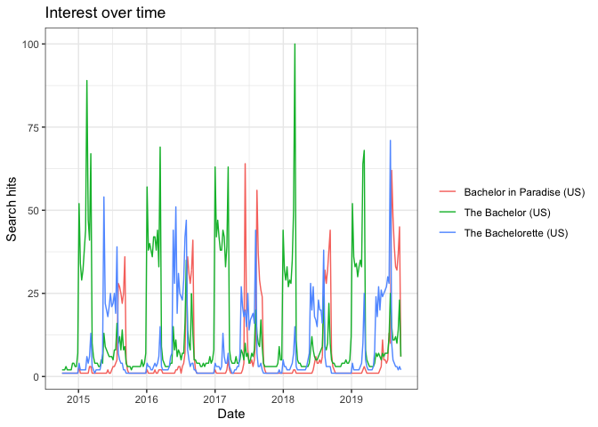bachTrends <- gtrends(c("Bachelor in Paradise", "The Bachelor", "The Bachelorette"), geo ="US")